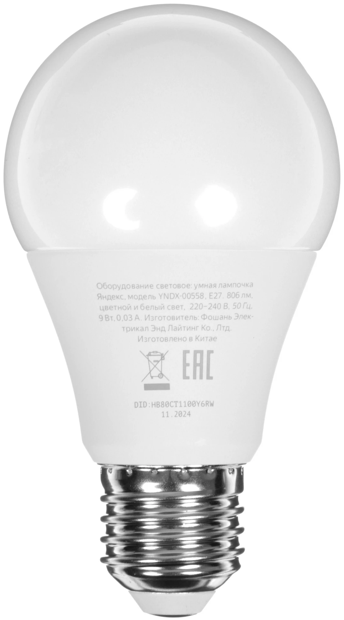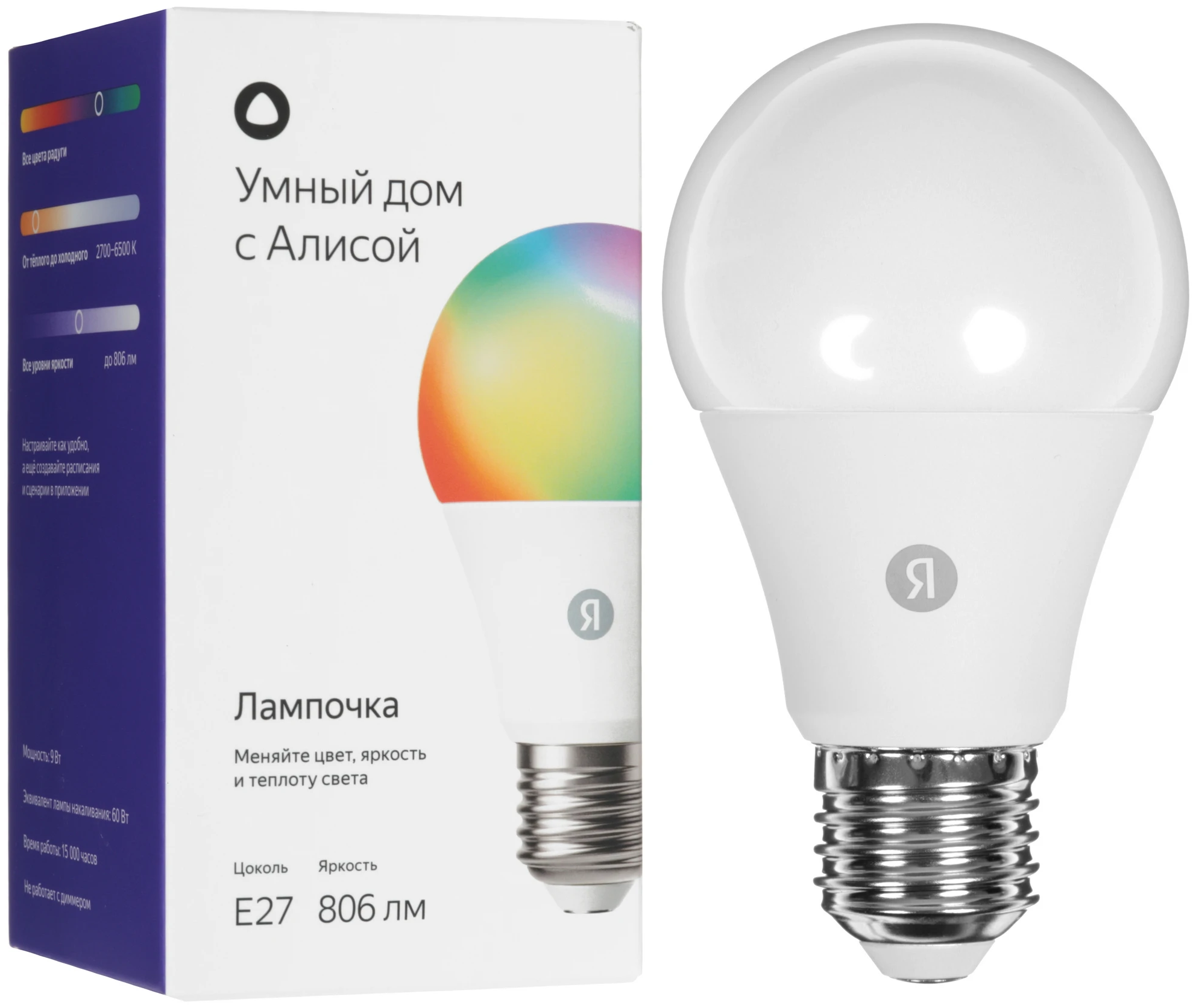 Дополнительно | мощность 9 Вт, цветовая температура 2700-6500 К, световой поток до 806 лм, цоколь Е27 |
